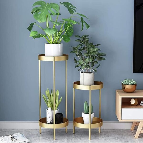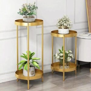 Upgrade your home décor with this modern and elegant two-tier metal plant stand. Designed with a sturdy iron frame and finished in a luxurious gold coating, this plant stand is perfect for showcasing plants in living rooms, offices, patios, or balconies. Its sleek and space-saving design makes it a great choice for contemporary interiors, adding a touch of sophistication while keeping plants neatly arranged.