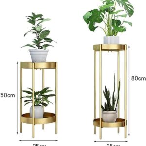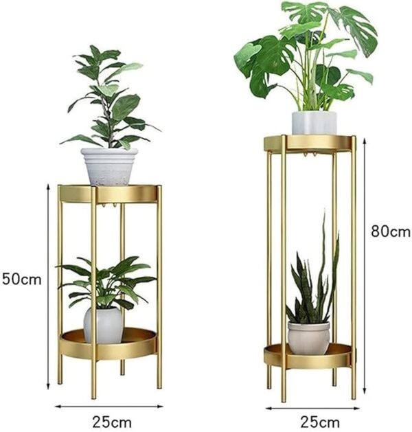Modern two-tier gold metal plant stand, available in 50 cm and 80 cm heights, featuring a sleek, minimalist design. Ideal for both indoor and outdoor use, this stylish stand provides an elegant way to display your plants.