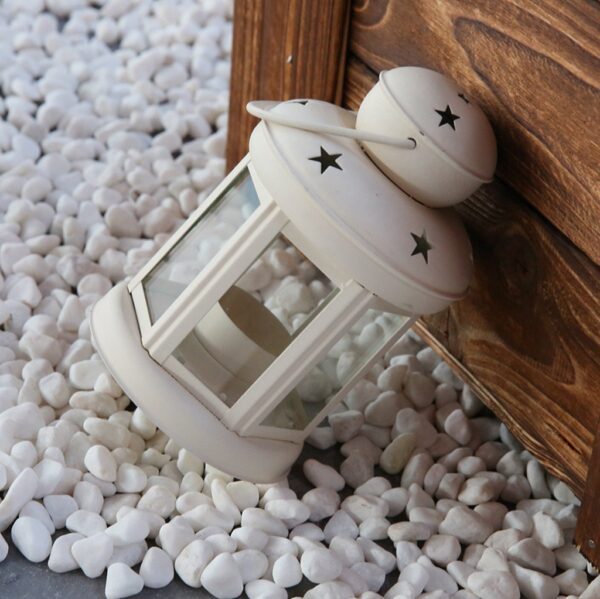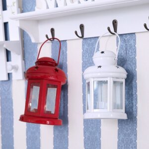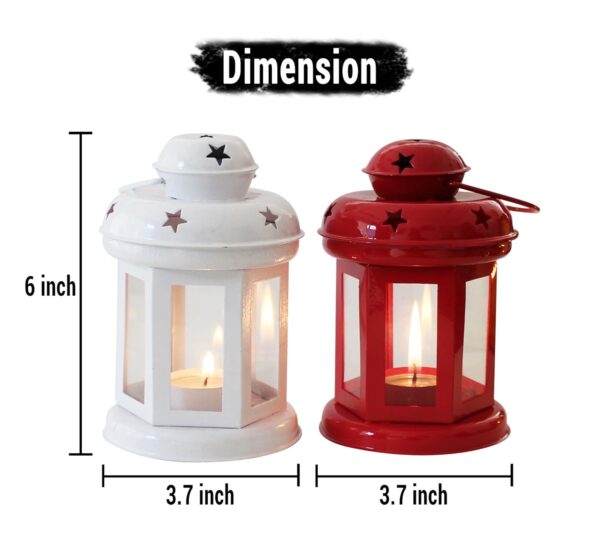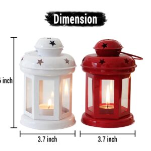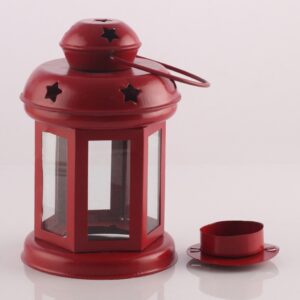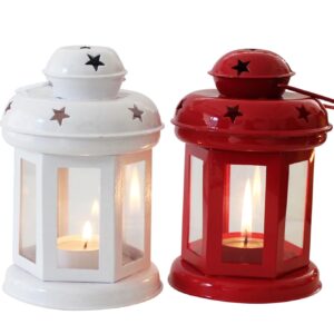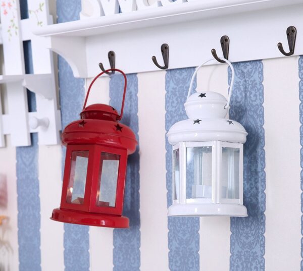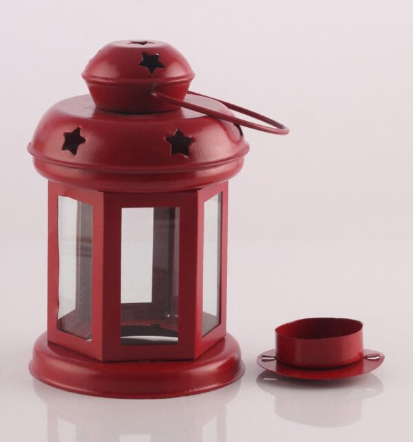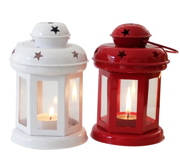 A stylish and functional metal lantern with a star-cut design, available in white and red, perfect for adding a cozy and festive touch to any space.