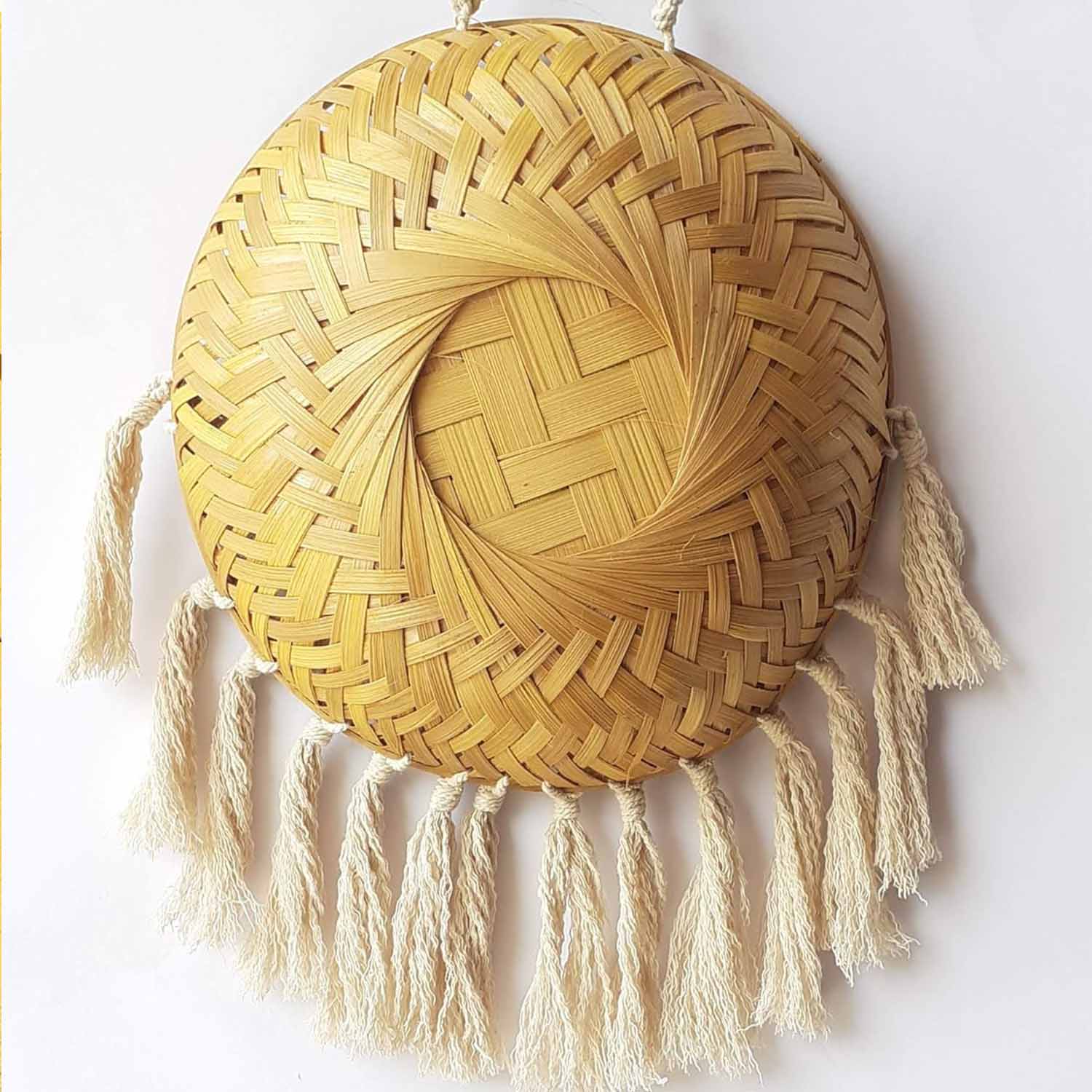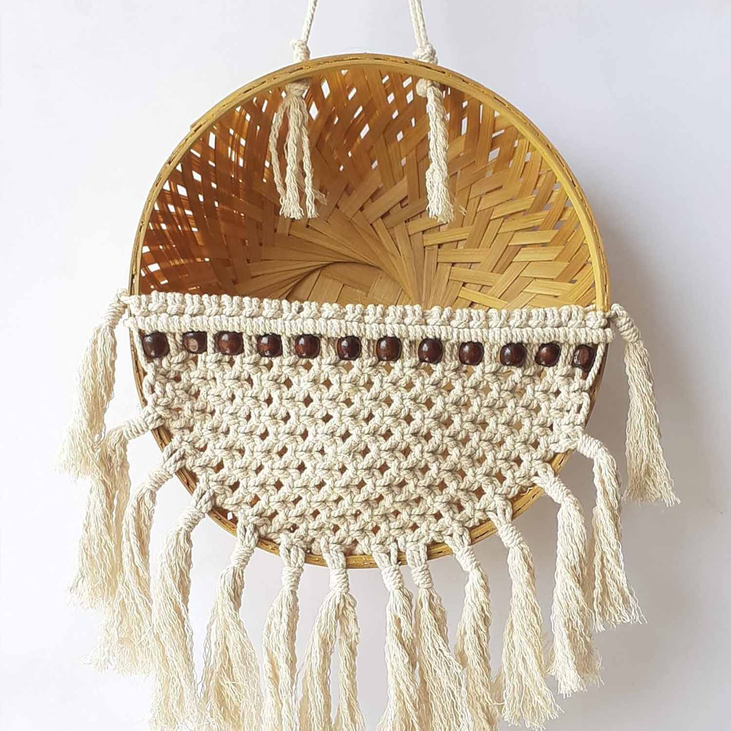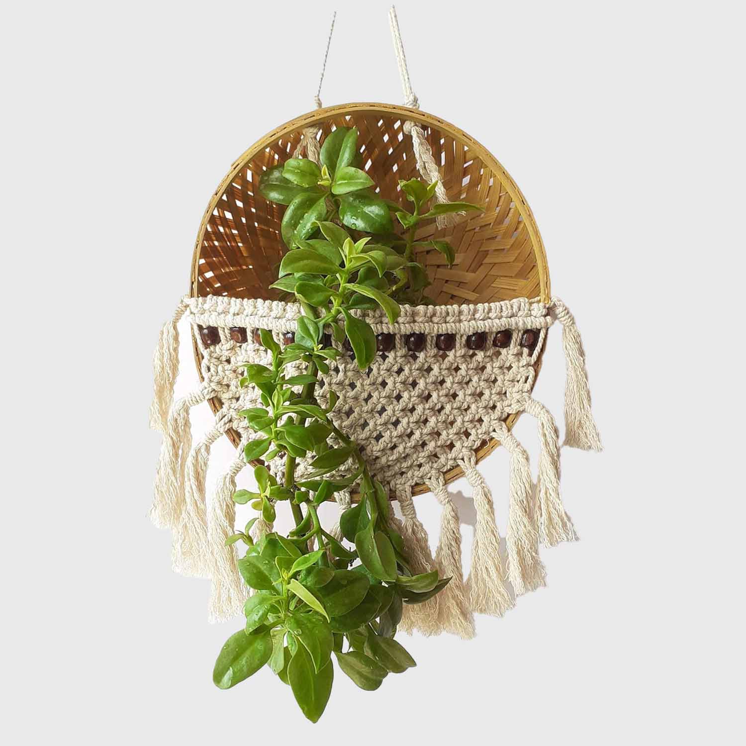Handwoven bamboo and macramé hanging planter, perfect for adding a boho touch to your home décor. Features intricate macramé detailing with wooden beads and tassels. Diameter: 9 inches.
