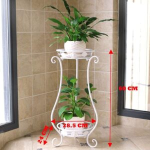 Enhance your home décor with this charming two-tier wrought iron plant stand. Featuring a durable white metal frame with beautifully curved legs and delicate floral accents, this stand is both stylish and sturdy. Ideal for displaying plants in living rooms, balconies, patios, or gardens, it provides an elegant way to showcase your greenery. The dual-tier design allows for multiple plants, maximizing space while adding a decorative touch to any setting.
