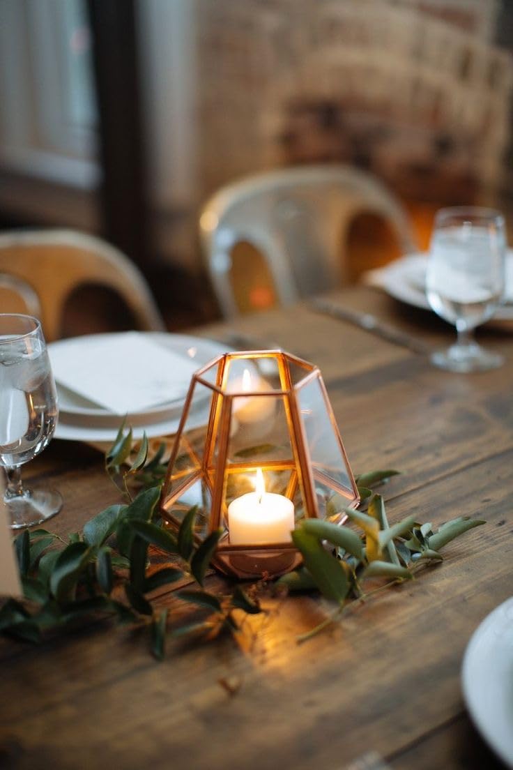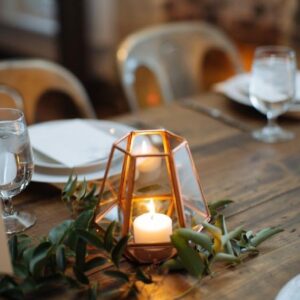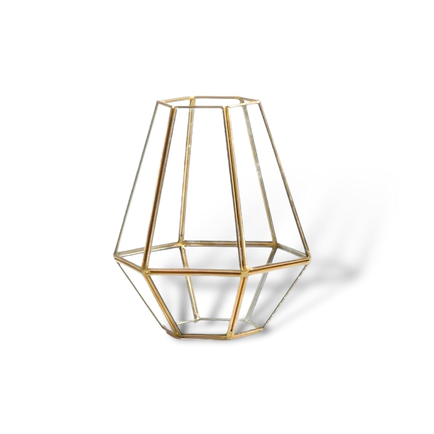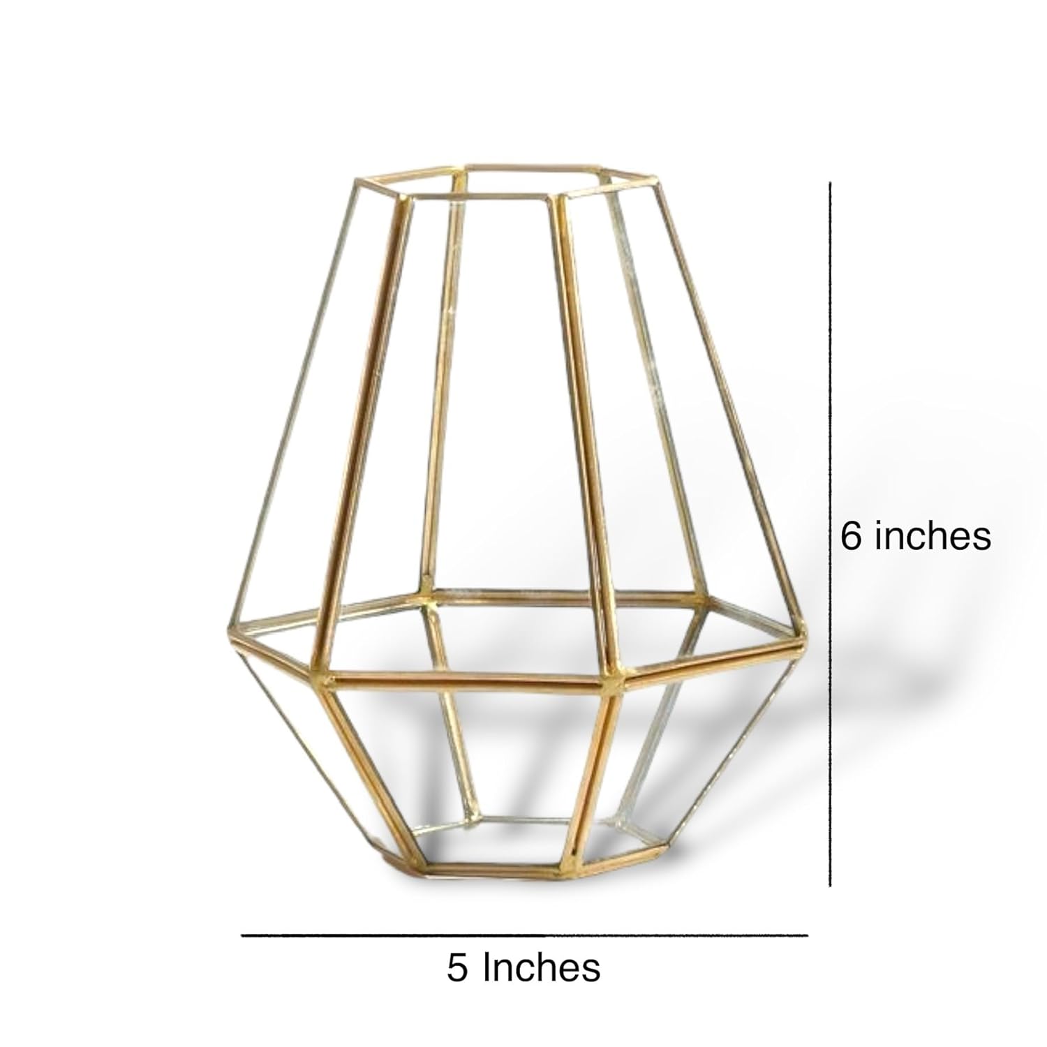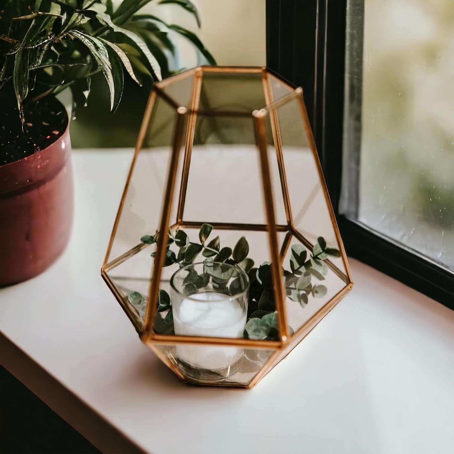 A modern geometric glass and metal candle holder, perfect for adding an elegant touch to any space. Its gold-tone metal frame and clear glass panels create a stunning display for candles, fairy lights, or decorative greenery.