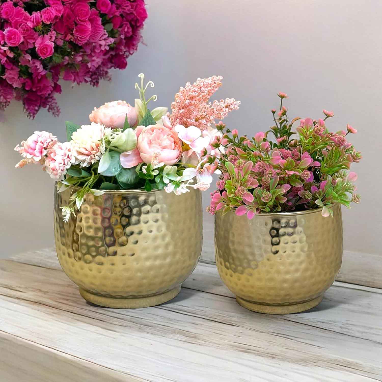 Upgrade your interior with this stunning set of 2 hammered gold-finish planters. Crafted to perfection, these decorative pots blend modern elegance with timeless charm. Ideal for small to medium-sized live or artificial plants, they make a statement in any setting—be it your living room, office, or balcony. The hammered texture adds a sophisticated touch, while the metallic gold finish complements a variety of décor styles.