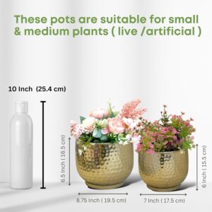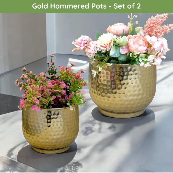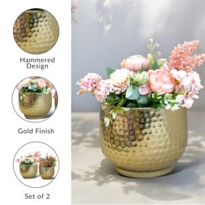 Enhance your home décor with this elegant set of 2 hammered gold-finish planters. Perfect for small to medium live or artificial plants, these pots add a luxurious touch to any space.