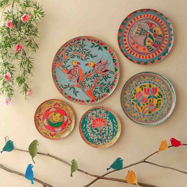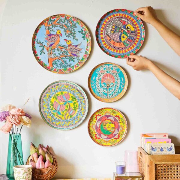 Set of 5 handcrafted wall plates with traditional Madhubani art
