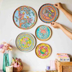 A stunning set of 5 handcrafted wooden wall plates featuring traditional Madhubani artwork. Painted in vibrant colors with intricate folk designs, this set adds an ethnic charm to any living space. Comes in various sizes to create a dynamic visual arrangement.