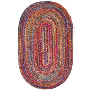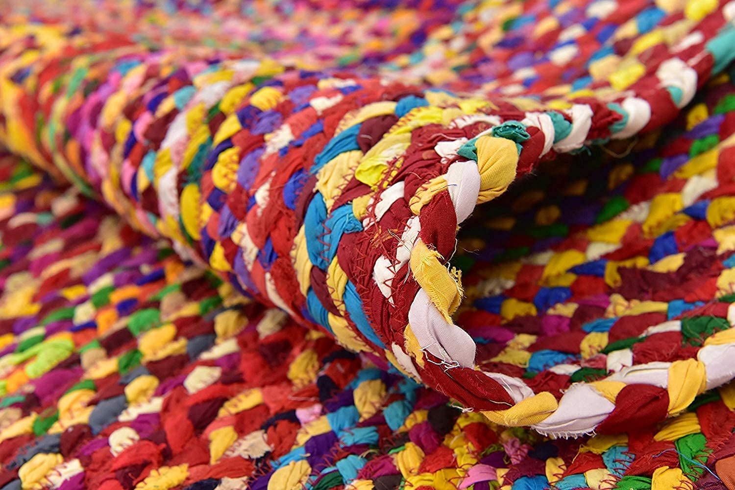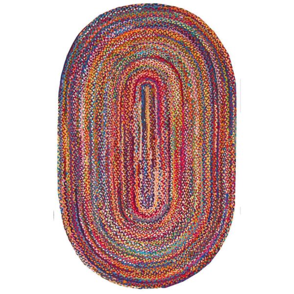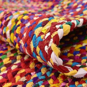 Add a pop of color and artisanal elegance to your home with this Handwoven Multicolor Braided Jute & Cotton Rug. Expertly crafted using a sustainable blend of natural jute and soft cotton, this oval-shaped 3×5 feet rug is a timeless decor piece that complements both modern and rustic interiors.