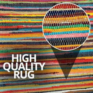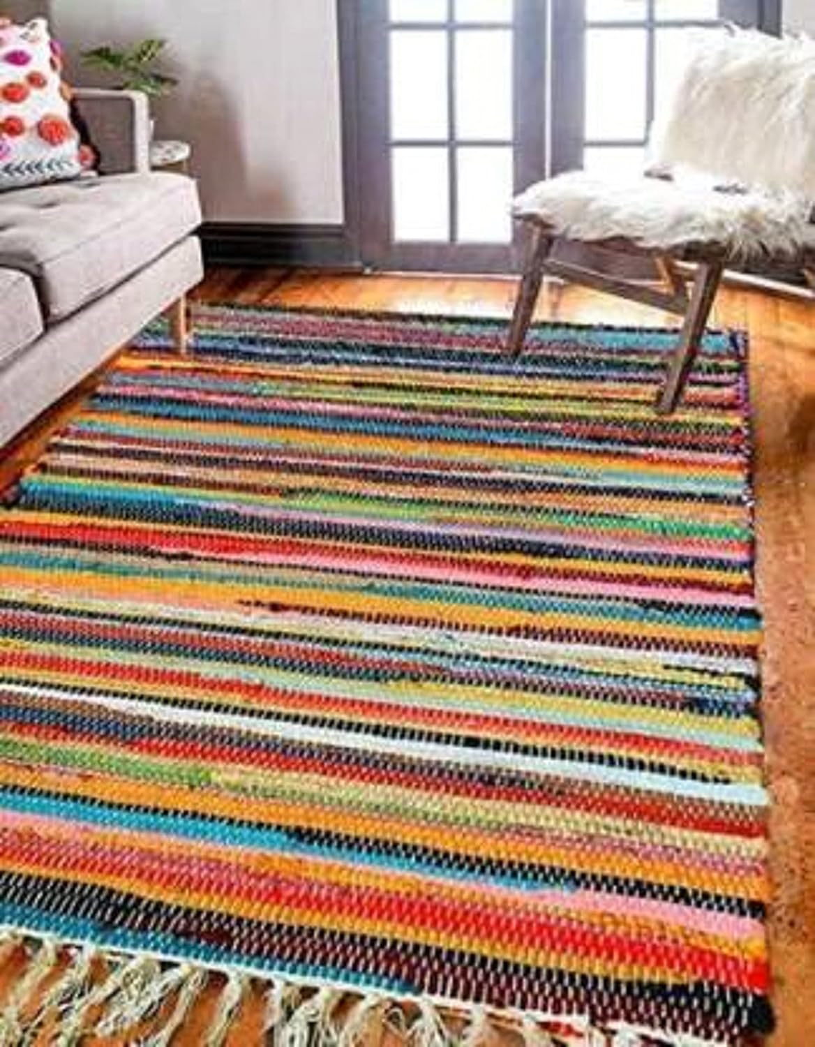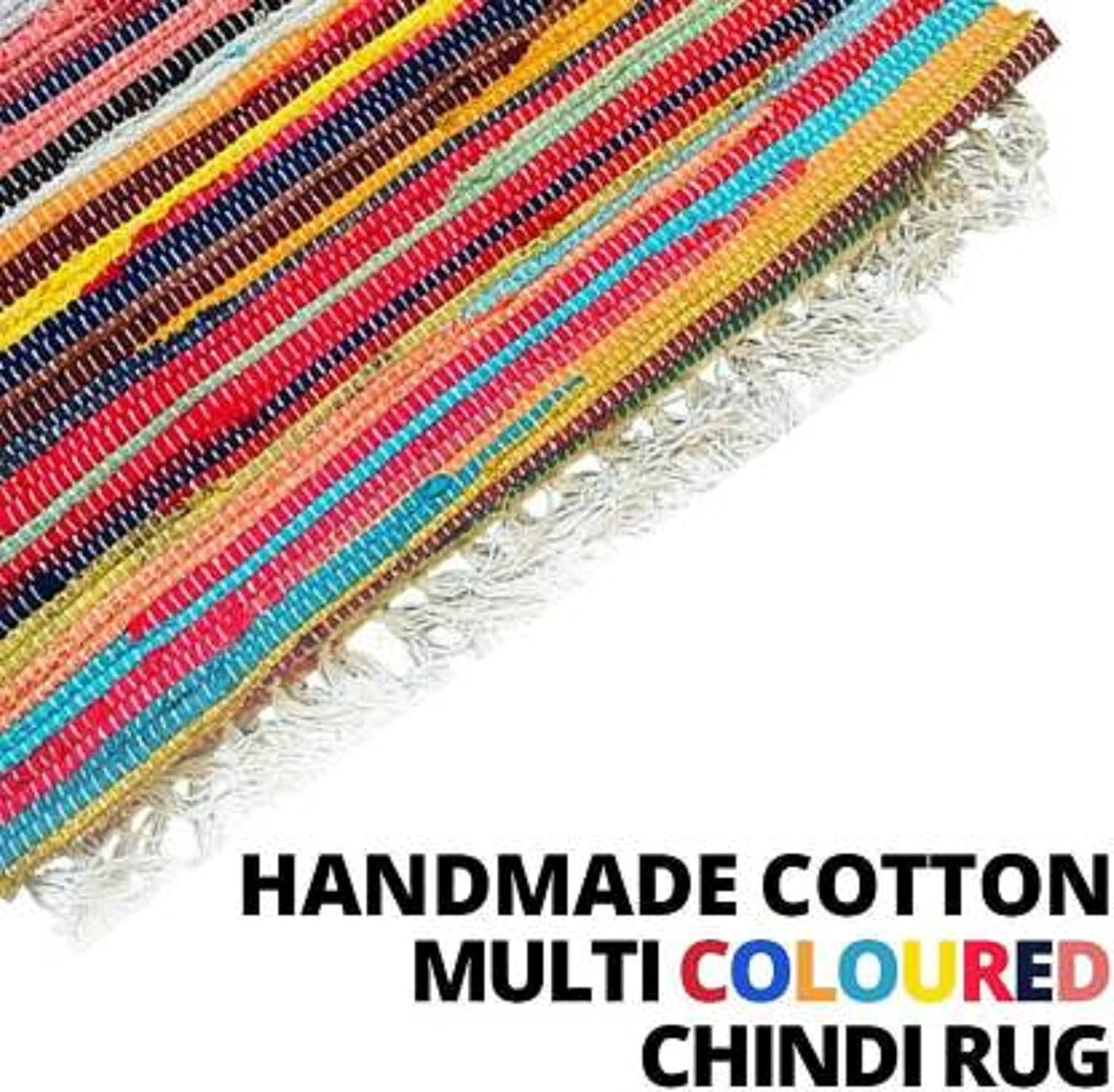 A handcrafted multicolor Chindi rug, made from recycled cotton fabric, featuring vibrant stripes and fringed edges for a boho-chic appeal.