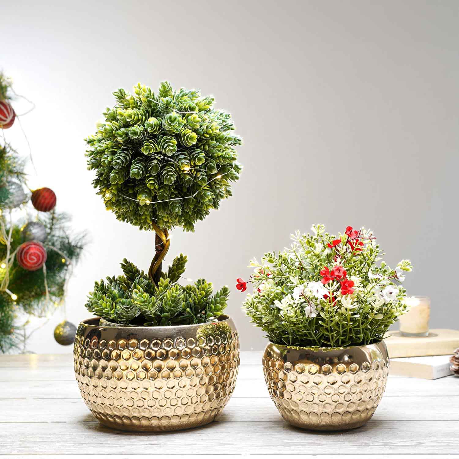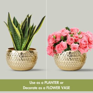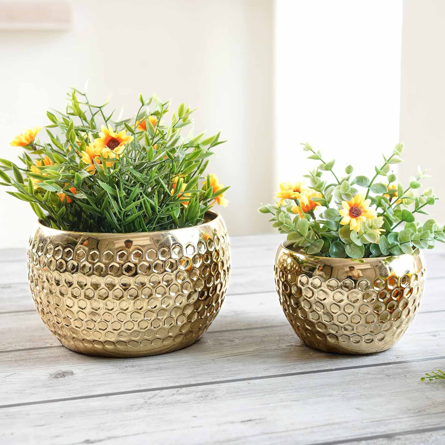 Enhance your home décor with this elegant set of two gold-toned metal planters. Perfect for tabletops or balconies, these versatile planters can be used for indoor plants or as decorative flower vases. Their modern hammered design adds a luxurious touch to any space.