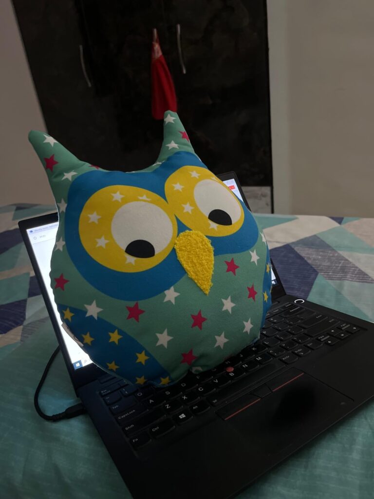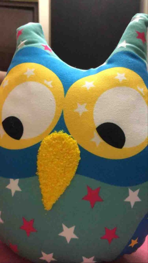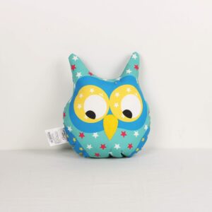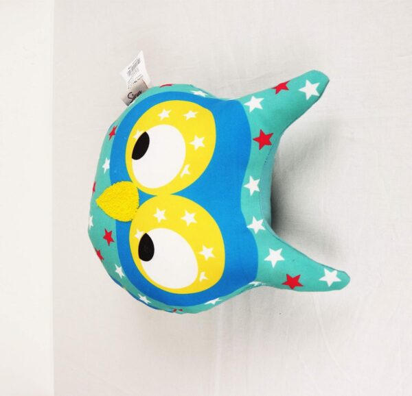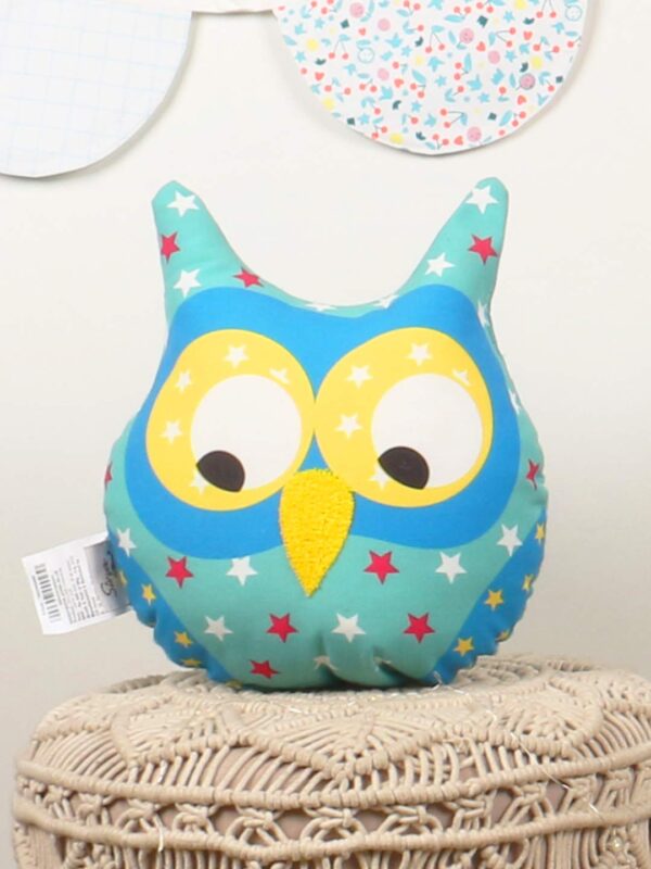 A charming plush owl cushion featuring a playful star-patterned design in shades of blue, red, and white. Its large, bright yellow eyes and soft textured beak give it an adorable expression. Placed on a beautifully woven macramé stool, the setting exudes a cozy and whimsical vibe. The pastel-toned circular wall decorations in the background add to the playful and cheerful ambiance.