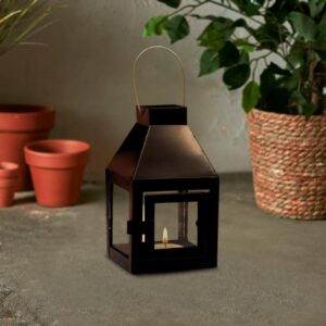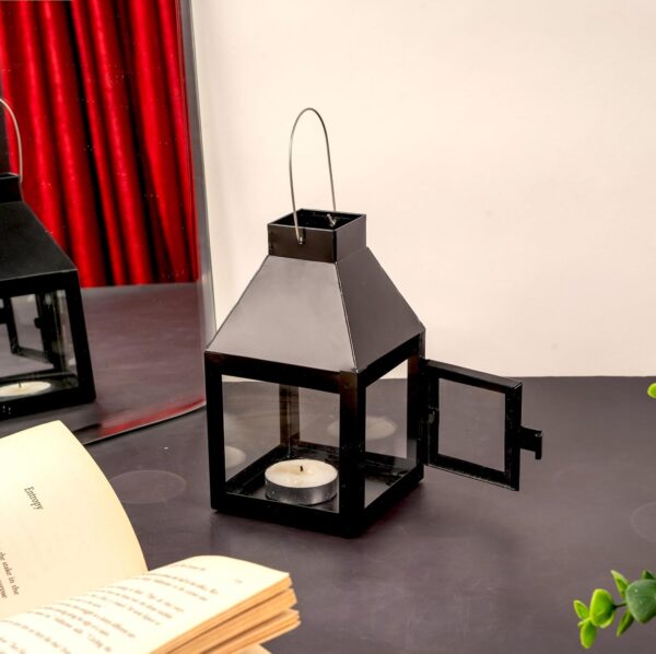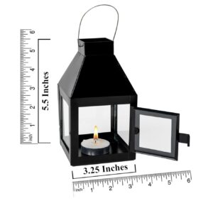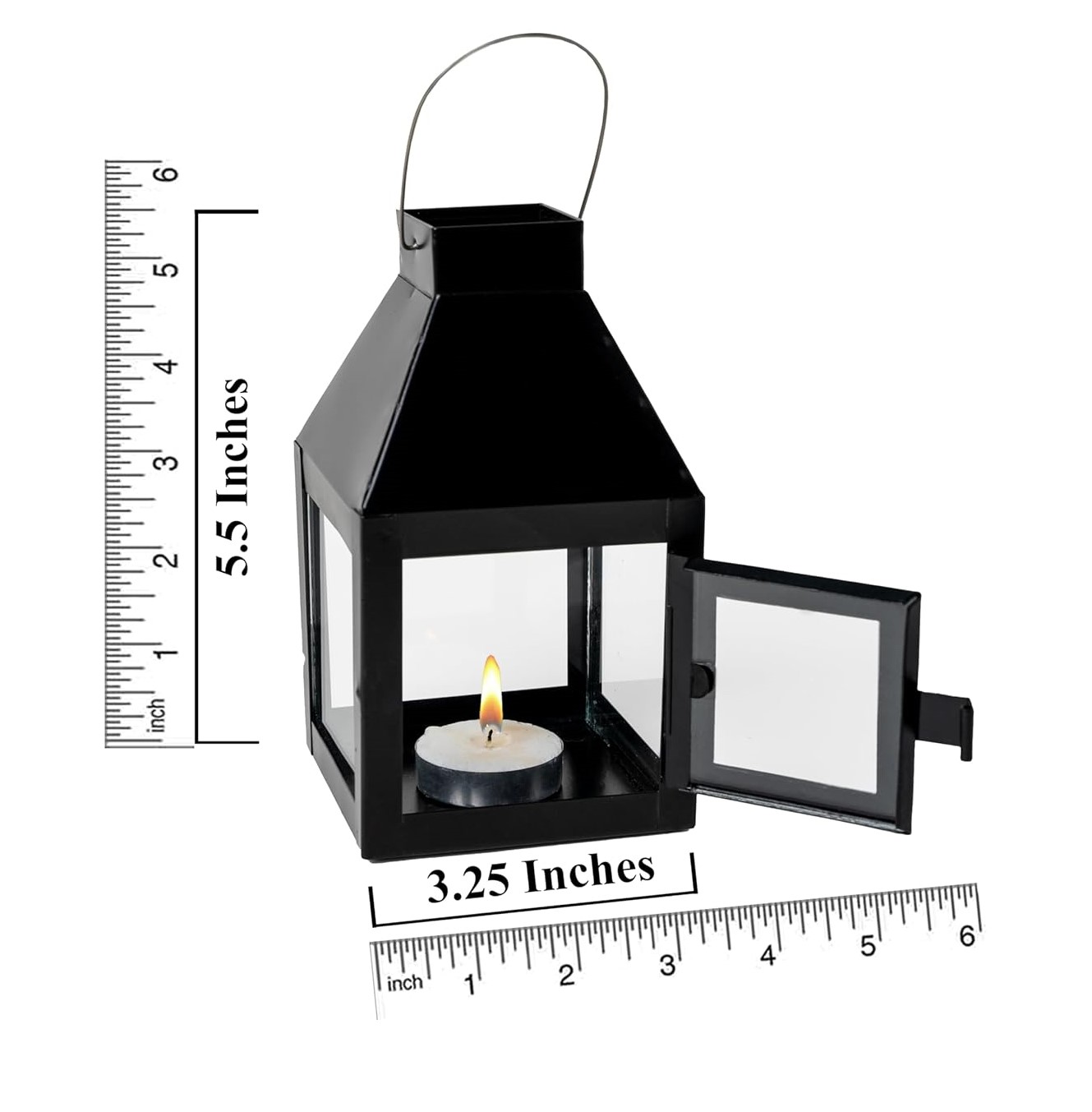 A charming mini black metal lantern with glass panels, perfect for adding a warm glow to any setting. Ideal for home décor, weddings, parties, or outdoor lighting, this lantern holds a tea light candle and features a handle for easy hanging or carrying.