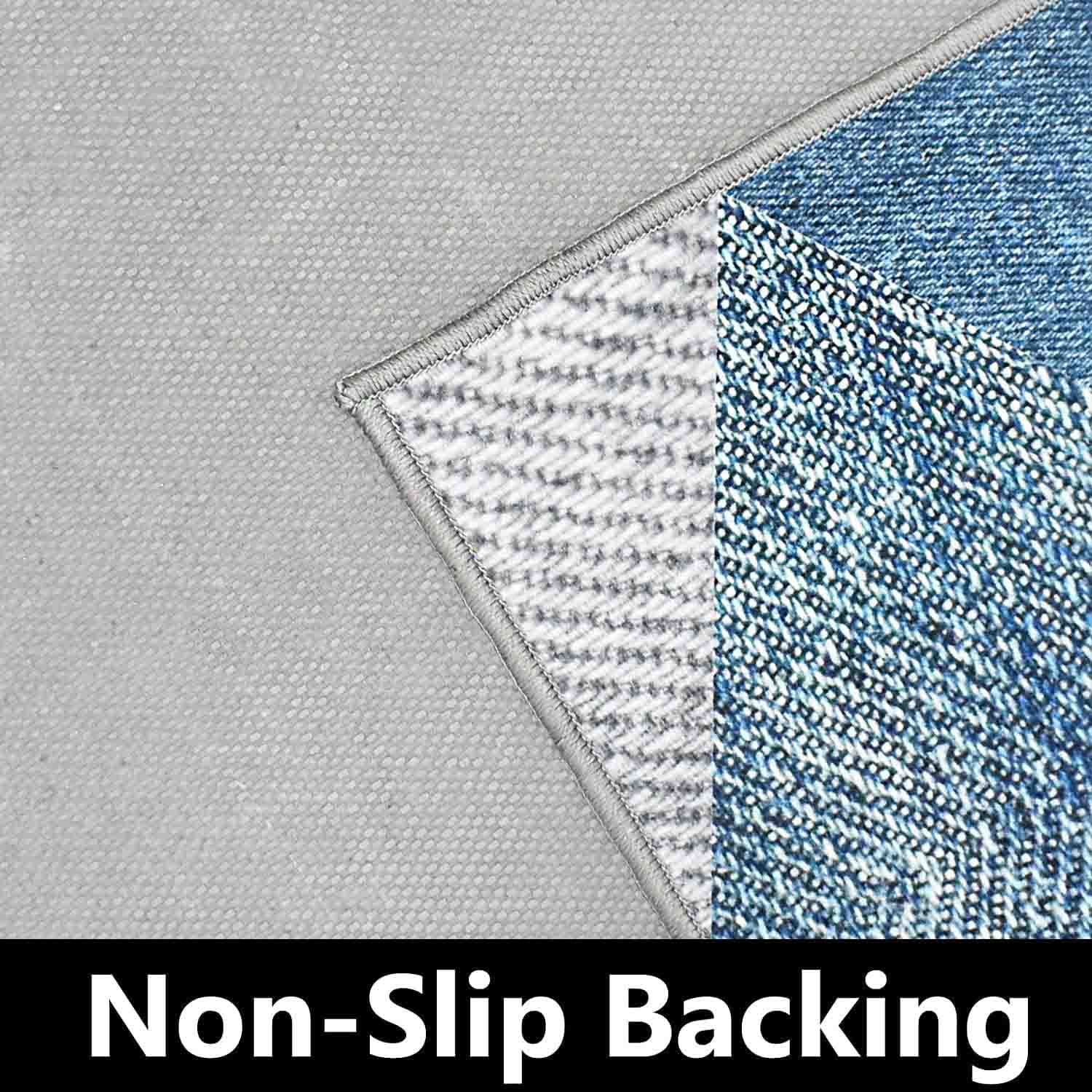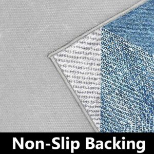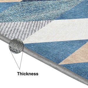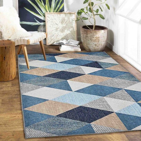 A stylish and durable area rug featuring a geometric pattern in shades of blue, beige, and white. Made with high-quality materials, this rug offers a soft texture, non-slip backing, and moisture-resistant properties, making it ideal for living rooms, bedrooms, offices, and more.