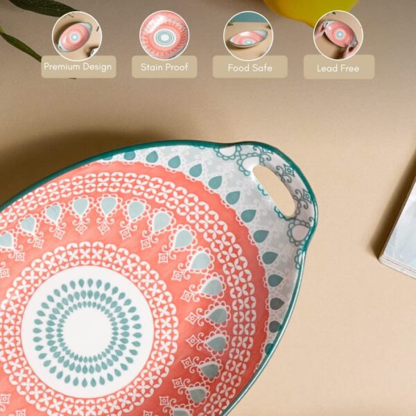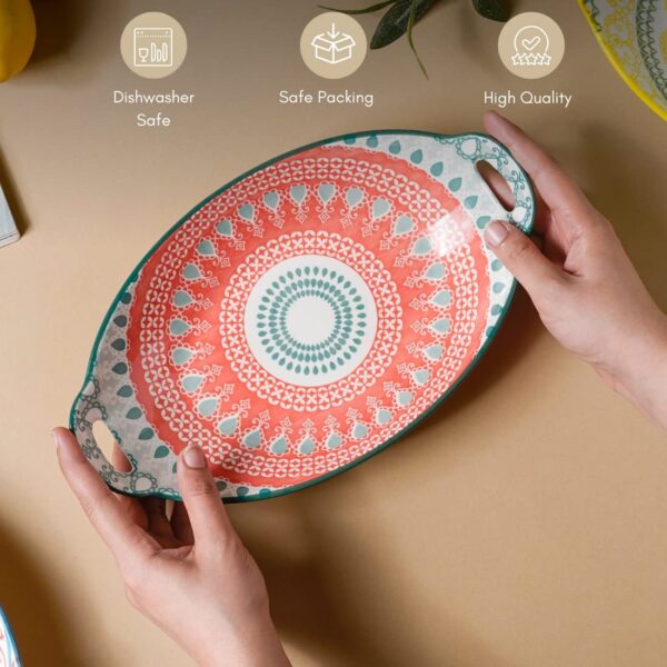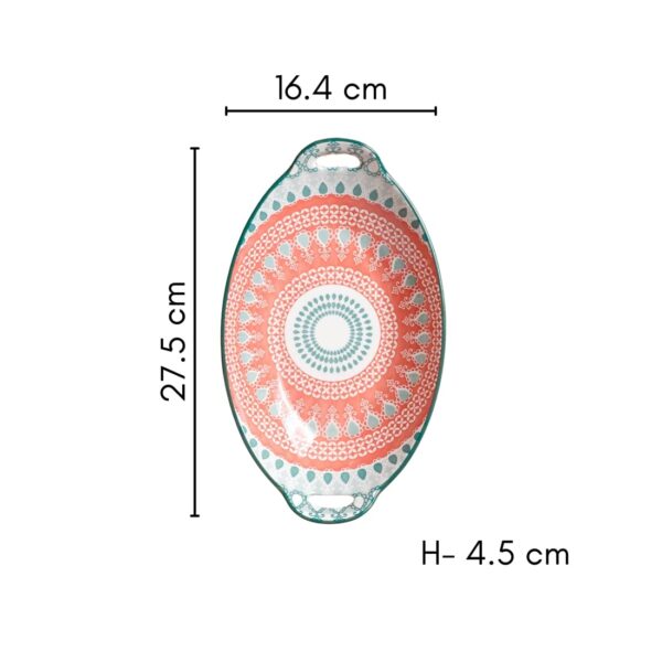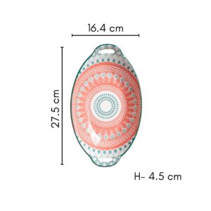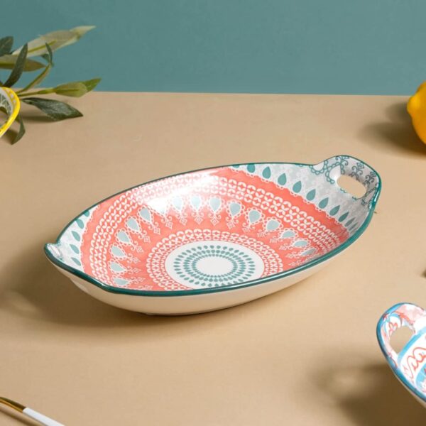 This is a beautifully designed oval ceramic serving platter with intricate patterns in coral, teal, and white hues. The platter features built-in handles for easy carrying, making it both functional and visually appealing. Ideal for serving appetizers, snacks, or main dishes, it adds an elegant touch to any dining setting. Perfect for special occasions or everyday use!