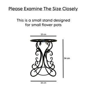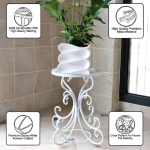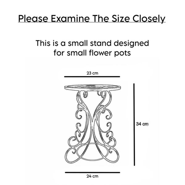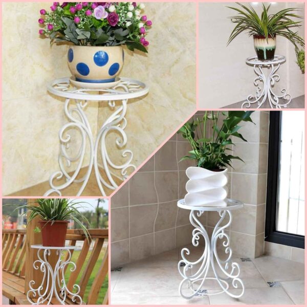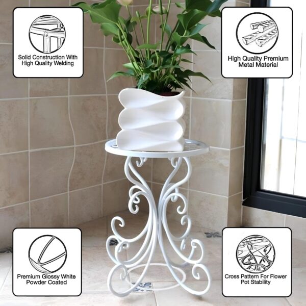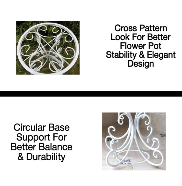 Enhance your home decor with this elegantly designed Metal Plant Stand. Made from high-quality premium metal, it features a glossy white powder-coated finish that adds sophistication and durability. With its intricate scrollwork design, cross-patterned top for stability, and circular base for balance, this stand is perfect for showcasing small flower pots in any indoor or outdoor setting.