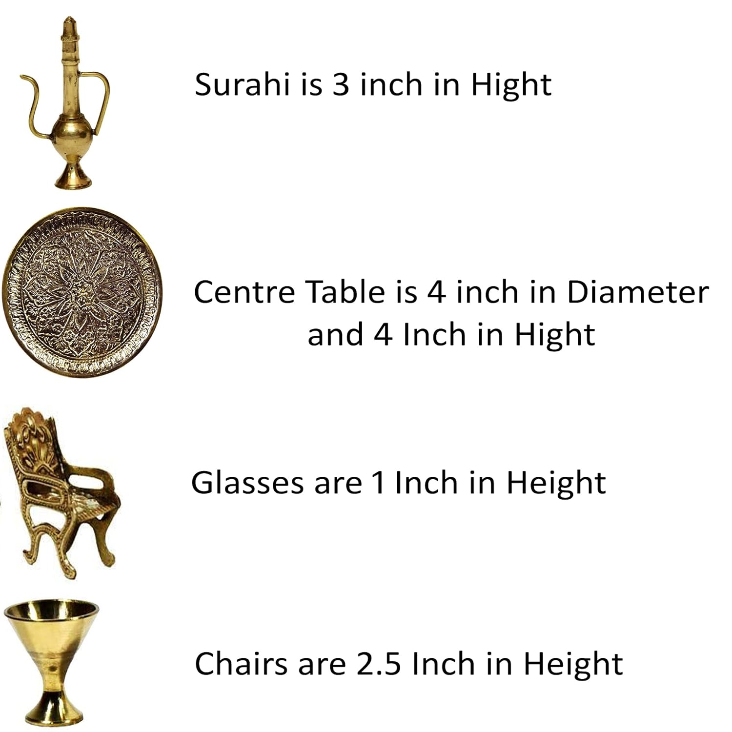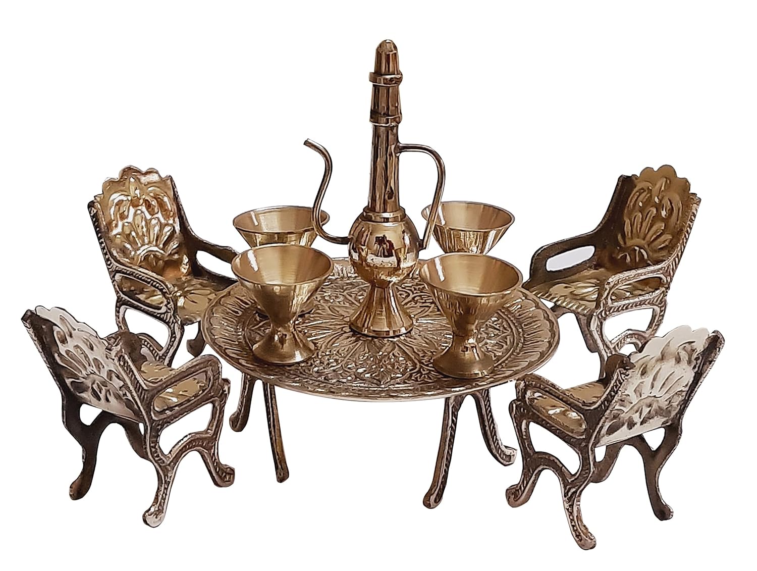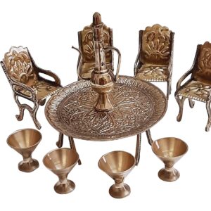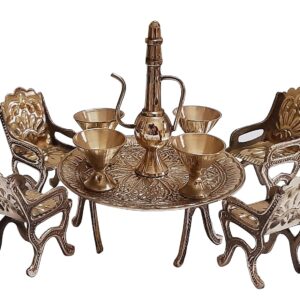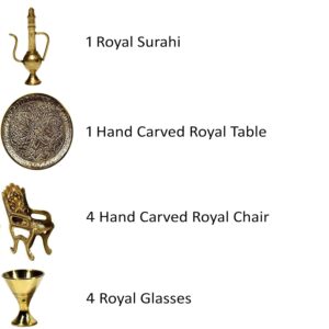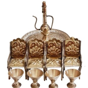 A handcrafted brass miniature tea set featuring intricate royal designs, including a beautifully carved table, chairs, glasses, and a surahi. Perfect for home decor, antique collections, and gifting.