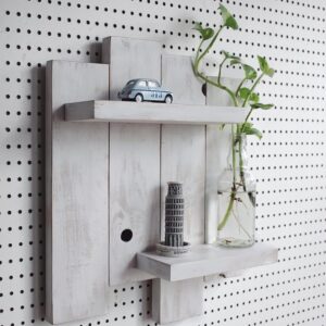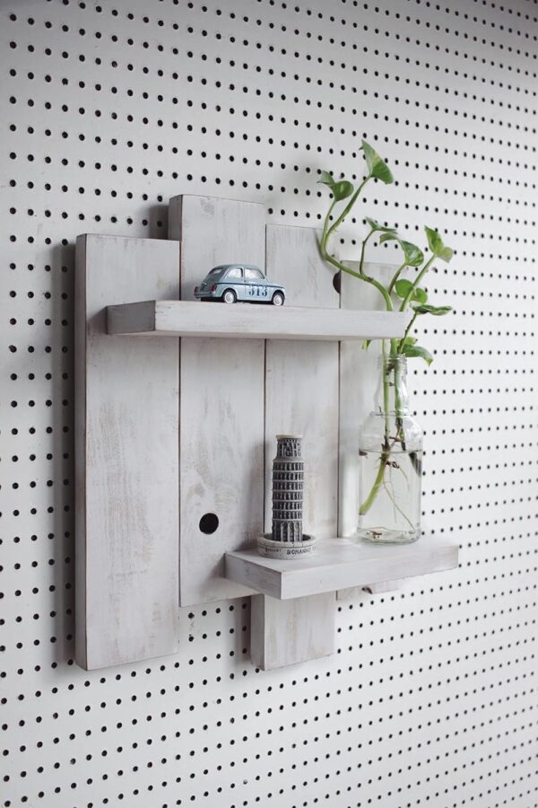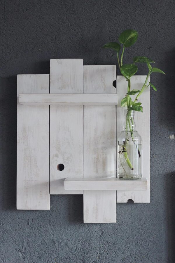 A handcrafted rustic white wooden wall shelf with an asymmetrical design, perfect for displaying small plants, vases, and decorative items.