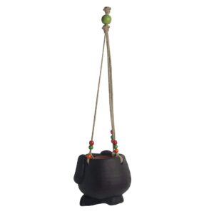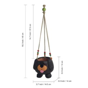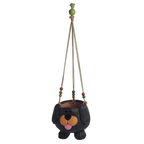 A charming dog-shaped ceramic hanging planter with a jute rope and colorful beads. Ideal for small plants and succulents, perfect for pet lovers.