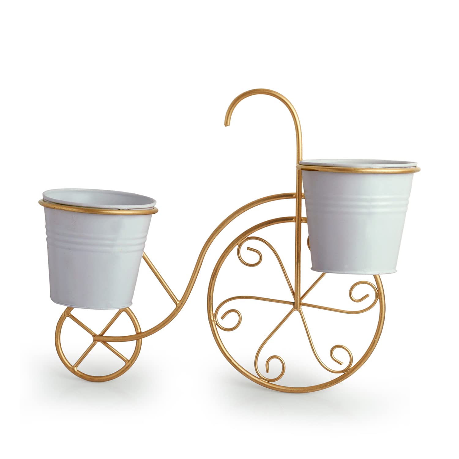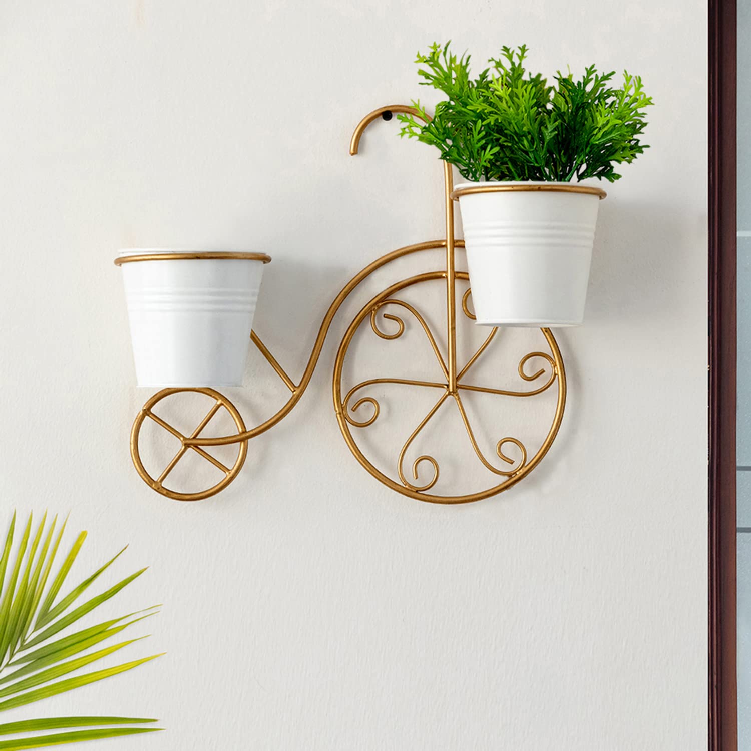 Bring a whimsical and rustic flair to your indoor décor with our Vintage Bicycle Wall Planter. Crafted from sturdy metal with a luxurious gold finish, this wall-mounted planter is designed in the shape of a classic bicycle, complete with intricate swirls and detailing. It includes two elegant white metal pots (each with a 600 ml capacity), ideal for showcasing your favorite small plants or floral arrangements.