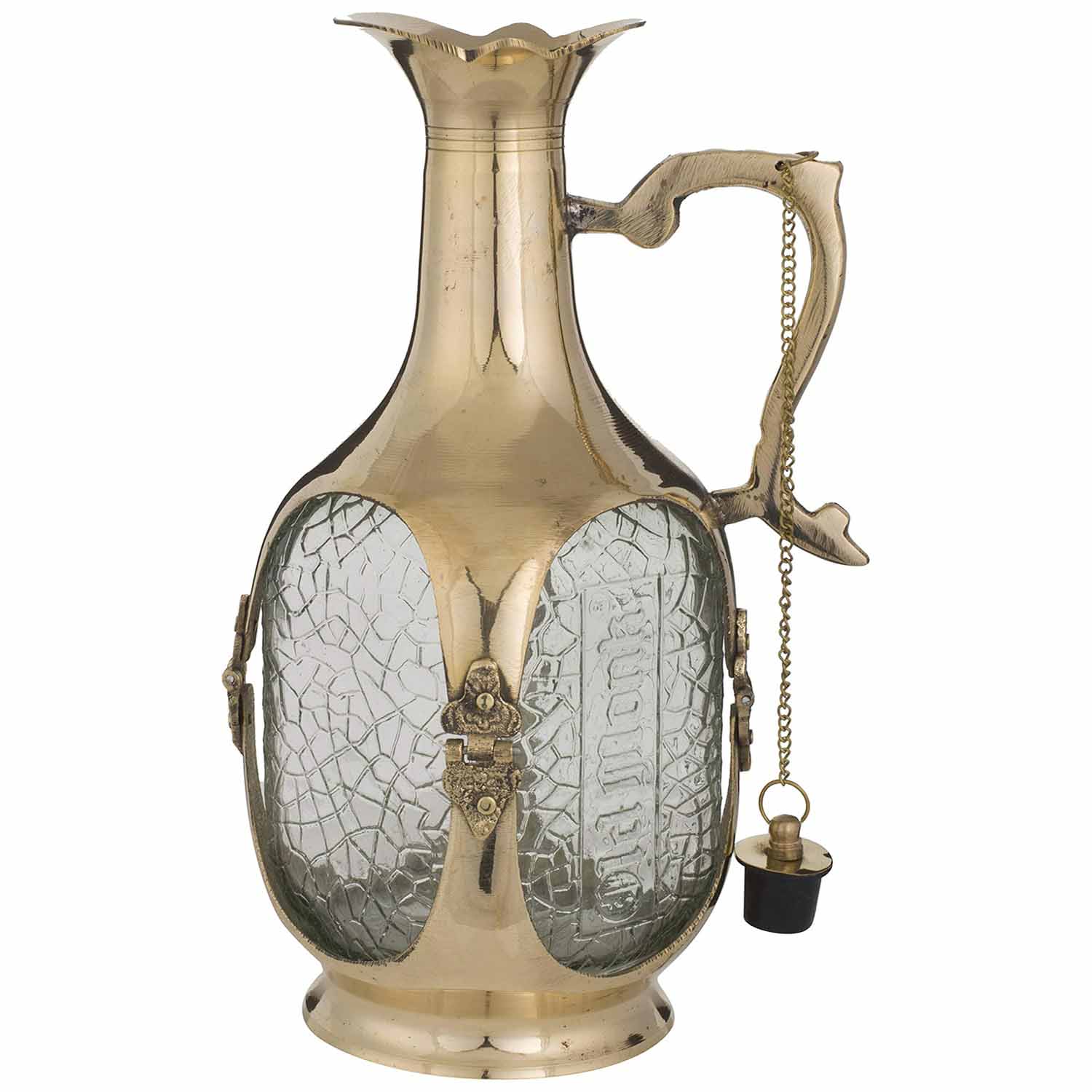 A stunning vintage-style brass and glass pitcher with intricate detailing, ideal for home decor or serving purposes. This handcrafted piece blends elegance and functionality, making it a perfect addition to any antique or classic-themed collection.