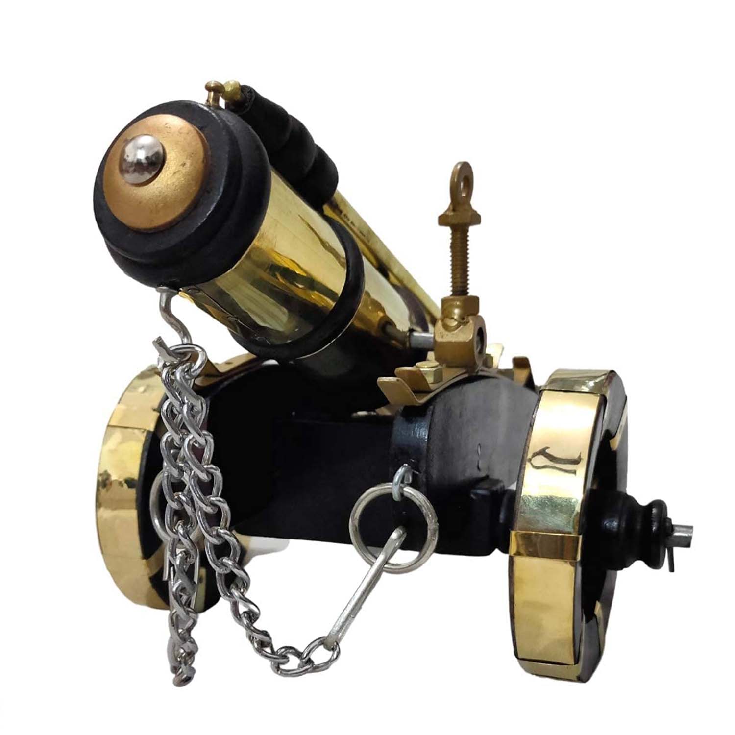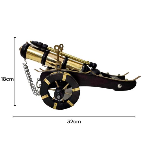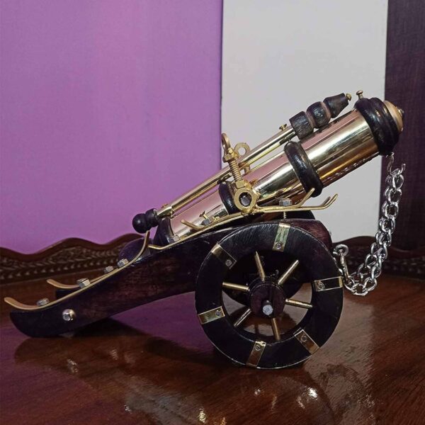 A stunning handcrafted vintage cannon showpiece made from premium brass and wood, featuring intricate detailing. This elegant decor item brings a historical and antique charm to any space, making it a perfect collectible or gift.