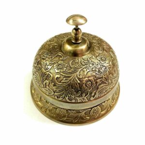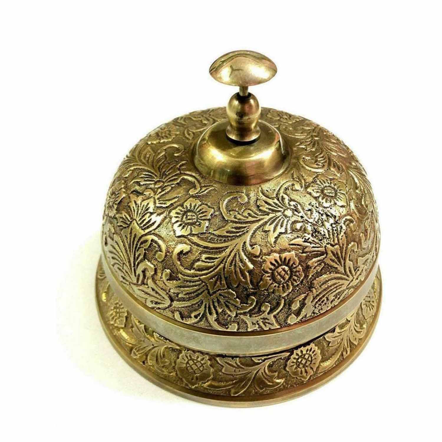 An intricately designed vintage brass service bell, featuring exquisite floral engravings. Perfect for reception desks, hotels, restaurants, or as a unique decor piece for your home. Produces a clear, crisp ringing sound with a simple press.