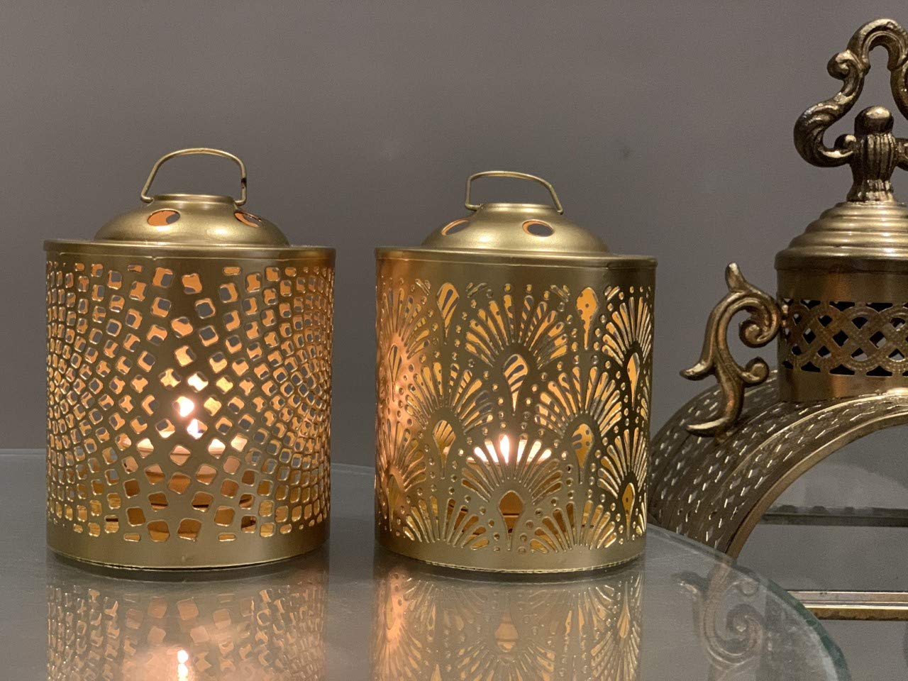 Add a touch of elegance to your home with this set of vintage-inspired gold metal lanterns. Featuring intricate cut-out patterns, these tea light holders create mesmerizing shadows when lit, making them perfect for festive decor, ambient lighting, or gifting.