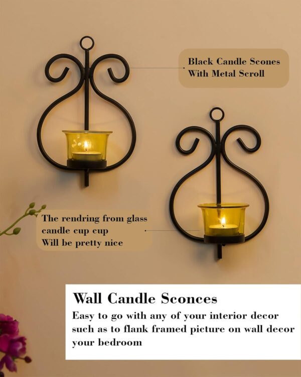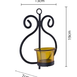 Transform your living space with these elegant wall candle sconces, featuring a vintage wrought iron scroll design. The beautifully curved metal frame holds an amber-tinted glass cup that diffuses soft, warm light, creating a cozy ambiance. Whether placed in the bedroom, hallway, or living room, these candle holders add charm and sophistication to your décor. Their classic design complements both modern and traditional interiors, making them perfect for home styling, romantic evenings, or festive decorations.